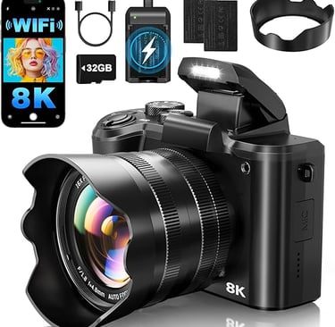Multifunctional 8K camera and high-capacity battery: Supports 16x digital zoom, slow motion, continuous shooting, and more. The image quality is exceptional, and the built-in flash function allows you to capture high-quality images even in low-light conditions. Includes a 32GB SD card and two high-capacity batteries, enabling extended shooting sessions without frequent recharging.